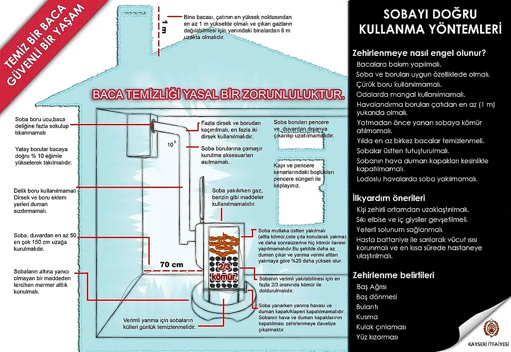 Kayseri Büyükşehir Belediyesi İtfaiye Daire Başkanlığı, karbonmonoksit gazı nedeniyle yaşanan ölümlerin önüne geçmek için katı yakıt kullanılan sobalı evler ile doğalgazlı evlerde dikkat edilecek hususlar konusunda vatandaşlara hayati ve kritik bilgiler v