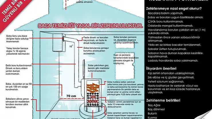 İtfaiye Daire Başkanlığı’nca sobalı evlerde yaşayan vatandaşların baca yangınlarına ve zehirlenmelerine karşı şu önlemleri alması uyarısında bulunuldu: