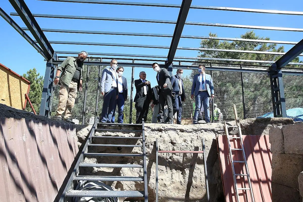 Kazı çalışmaları tamamlanan eyvan tipi türbeyi yerinde inceleyen Başkan Büyükkılıç, kazı ile ilgili İl Kültür ve Turizm Müdürü Şükrü Dursun ile Kent Tarihi ve Tanıtımı Daire Başkanı Gürcan Senem’den bilgiler aldı.