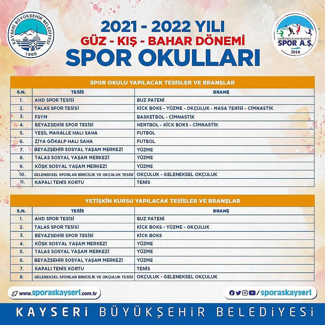 Spor A.Ş. tarafından düzenlenen kış dönemi spor okulları, kurs programı kapsamında futboldan basketbola, okçuluktan tenise, yüzmeden kick boksa birbirinden farklı 11 dalda kurs ile sporseverlere hizmet verecek. Kayseri Büyükşehir Belediyesi 11 tesisi ile geniş yelpazedeki kurs çeşitliğiyle sporun ve sporcunun yanında yer almaya devam edecek.