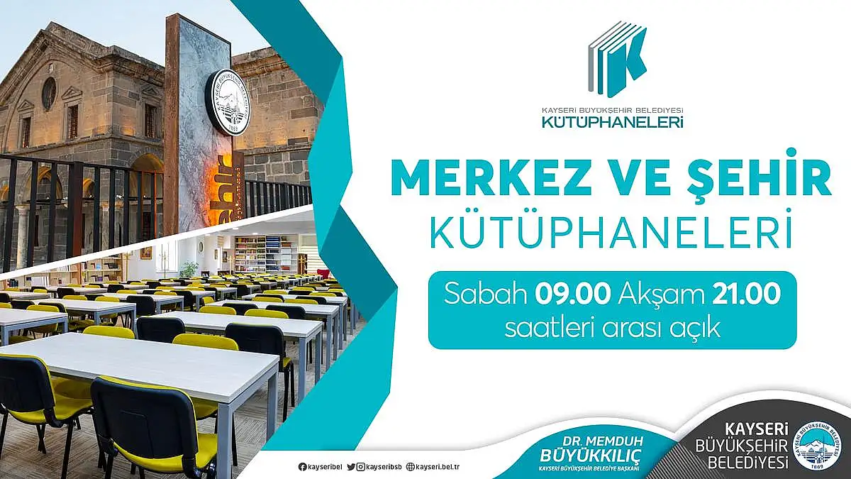 Kayseri Büyükşehir Belediyesi'ne ait Merkez Halk Kütüphanesi ve Şehir Kütüphanesi'nin çalışma saatleri Başkan Dr.Memduh Büyükkılıç'ın talimatıyla haftanın 7 günü 09.