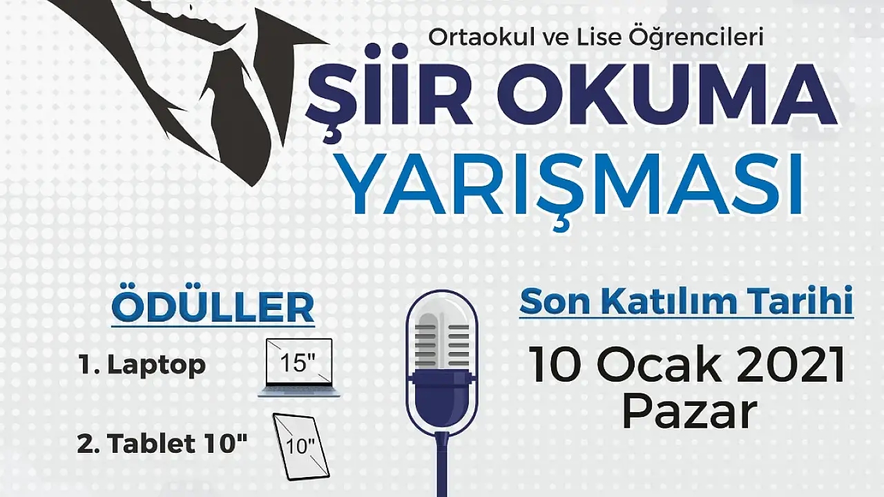 Büyükşehir Belediyesi bünyesindeki KAYMEK A.Ş. tarafından düzenlenen Asım’ın Nesli, Akif’in Şiirlerine Ses Veriyor Şiir Okuma Yarışması, ortaokul ve lise düzeyinde olmak üzere iki kategoride yapılacak ve seçici kurul tarafından değerlendirilecek. KAYMEK, yarışmada 1. olanlara laptop, 2. olanlara tablet, (ekran boyutu 10") 3. olanlara tablet (ekran boyutu 7”) hediye ederken, 4. 5. ve 6. olan yarışmacılara mansiyon ödülü olarak 500 TL değerinde kitap seti ve kaynak kitap hediye edecek. Yarışmaya başvurular, 10 Ocak Pazar günü sona erecek.