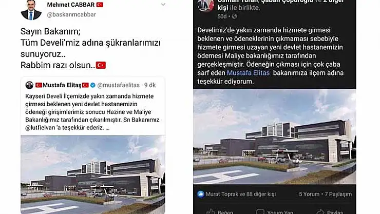 AK Parti Develi İlçe Başkanı Osman Turan ise, paylaşımında, ödeneklerin çıkmaması nedeniyle uzayan Develi Devlet hastanesinin ödemesini Maliye Bakanlığının yaptığını belirtti. Turan, "Develi'miz de yakın zamanda hizmete girmesi beklenen ve ödeneklerinin çıkmaması sebebiyle hizmete girmesi uzayan yeni devlet hastanemizin ödemesi Maliye Bakanlığımız tarafından gerçekleşmiştir. Ödeneğin çıkması için çok çaba sarf eden bakanımız Mustafa Elitaş'a ilçem adına teşekkür ediyorum" diye konuştu.