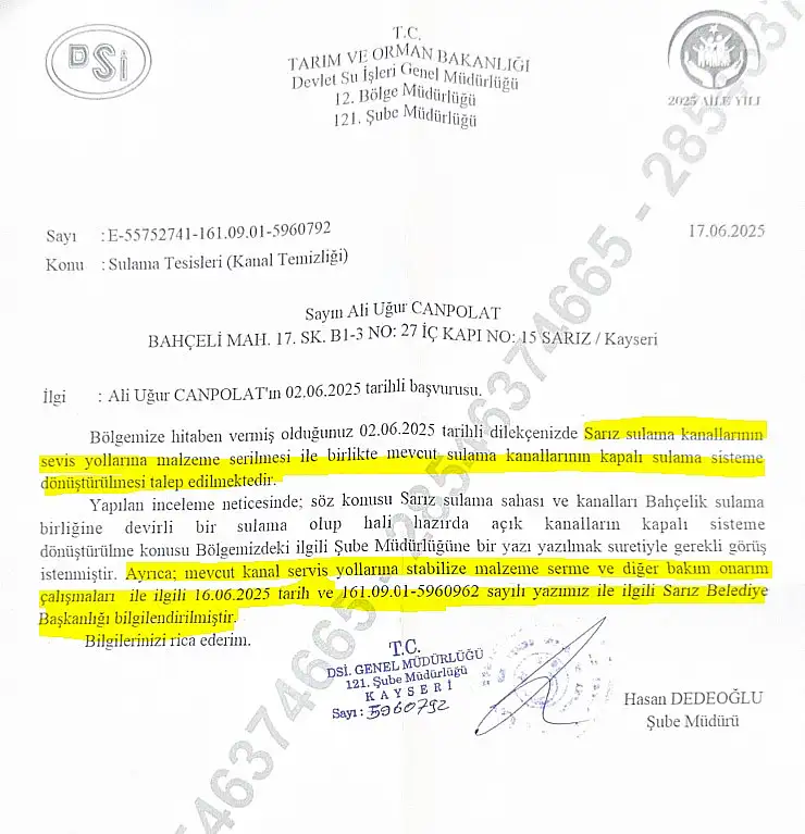 Sarız Belediye Meclis Üyesi Ali Uğur Canpolat, Sarız Belediye Başkanı Ömer Faruk Eroğlu’nun “Bazı kişilerin emeğe ortak olma çabaları” sözlerine yaptığı yazılı açıklama ile tepki gösterdi. Canpolat, 2 Haziran’da Devlet Su İşleri’ne (DSİ) sulama altyapısının iyileştirilmesi için resmi başvuru yaptığını ve sürecin belgelerle kayıt altına alındığını belirtti.