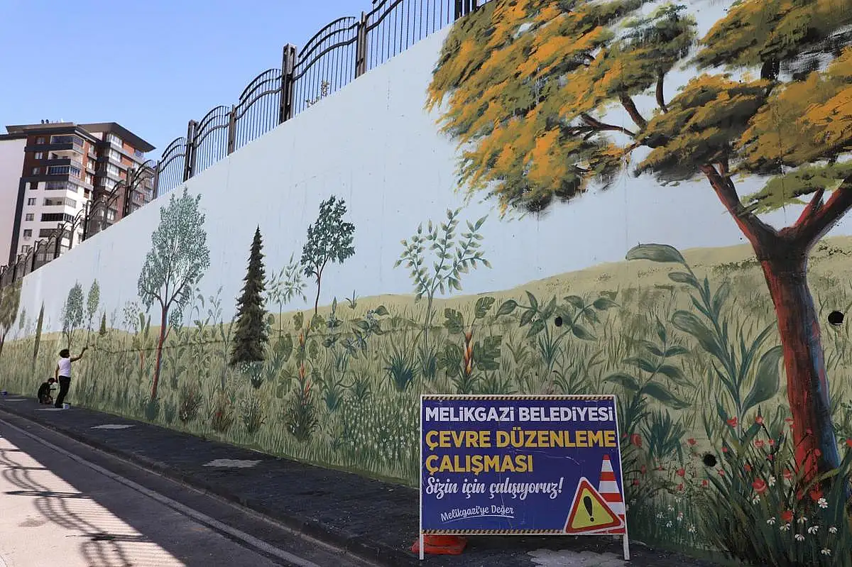 Doğa ve çevre için yaptığı çalışmalarla örnek olan Melikgazi Belediyesi Osman Ulubaş Okulu'nun bahçe duvarlarına ağaç ve orman manzaralı resimler çiziyor.Duvarlara çizilen resimlerle mahallenin mimarisine renk katıldığını söyleyen Melikgazi Belediye Başka