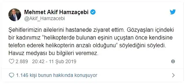 Cumhuriyet Halk Partisi Milletvekili Mehmet Akif Hamzaçebi, şehit askerlerimizden birinin helikoptere binmeden önce eşini arıyarak, helikopterin arızalı olduğunu söylediğini iddia etti.