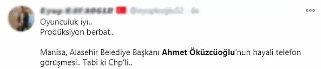 Manisa'nın CHP'li Alaşehir İlçe Belediye Başkanı Ahmet Öküzcüoğlu'nun hayali telefon görüşmesi sosyal medyada gündem oldu. Öküzcüoğlu'nun telefonu açmadan muhtarla projeleri hakkında görüşmesi sosyal medyada alay konusu oldu.