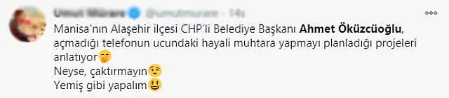 Manisa'nın CHP'li Alaşehir İlçe Belediye Başkanı Ahmet Öküzcüoğlu'nun hayali telefon görüşmesi sosyal medyada gündem oldu.Öküzcüoğlu'nun telefonu açmadan muhtarla projeleri hakkında görüşmesi sosyal medyada alay konusu oldu.