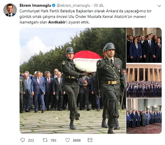 CHP Genel Başkan Yardımcısı Seyit Torun, aralarında İstanbul Büyükşehir Belediye Başkanı Ekrem İmamoğlu'nun da bulunduğu belediye başkanları ile Anıtkabir'i ziyaret etti. Aslanlı Yol'dan yürüyerek Anıtkabir'e giren CHP'liler, Mustafa Kemal Atatürk'ün mozolesine çelenk bıraktı. Saygı duruşunda bulunulması ve İstiklal Marşı'nın okunmasından sonra CHP'li heyet Misak-ı Milli Kulesi'ne geçti.