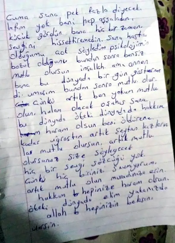 Özlem K.`nin kendi el yazısıyla eşine, kayın validesine ve halasına hitaben yazdığı mektubunda, eşi ve ailesiyle ilgili duygularını ifade ederek, kendisini cinnete götüren sebepleri açıkladı. Özlem K.`nin mektubunda, "Cuma sana diyecek pek fazla lafım yok. Beni hep aşağıladın, küçük gördün. Bana hiçbir zaman sevgini hissettirmedin. Sana hasta olduğumu çok söyledim, psikolojimin bozuk olduğu. Bundan sonra bensiz mutlu olursun inşallah. Ama annen bu dünyada bana gün göstermedi. Umarım bundan sonra mutlu olur. Çünkü artık ben yokum, mutlu olun. Halam olacak o şahıs, sana bu dünyada öteki dünyada da hakkım haram olsun. Beni öldürene kadar uğraştın.