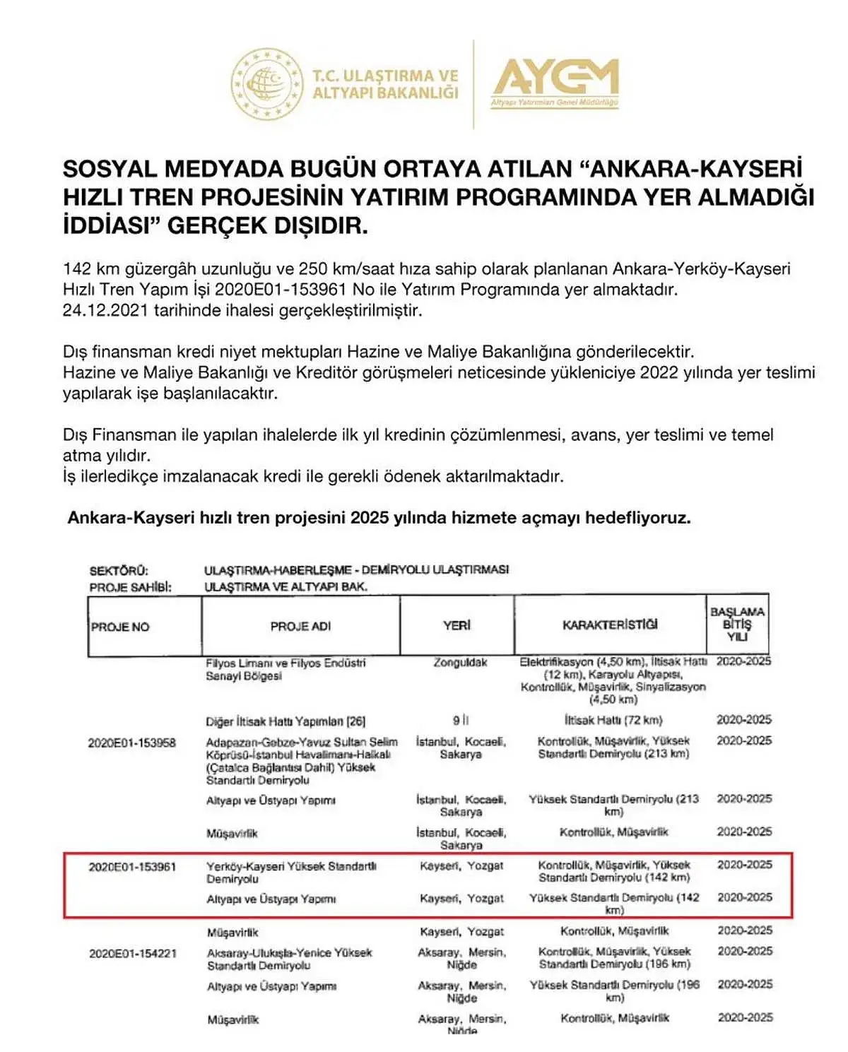 Ulaştırma ve Alt Yapı Bakanlığı'ndan yapılan açıklamada ise şu ifadelere yer verildi; "Sosyal medyada bugün ortaya atılan "Ankara-Kayseri Hızlı Tren Projesi'nin yatırım programında yer almadığı iddiası" gerçek dışıdır. 142 km güzergah uzunluğu ve 250 km/saat hıza sahip olarak planlanan Ankara-Yerköy-Kayseri hızlı tren işi 2020E01-153961 no ile yatırım programında yer almaktadır. 24.12.2021 tarihinde ihalesi gerçekleştirilmiştir. Dış finansman kredi niyet mektupları Hazine ve Maliye Bakanlığı'na gönderilecektir. Hazine ve Maliye Bakanlığı ve kreditör görüşmeleri neticesinde yükleniciye 2022 yılında yer teslimi yapılarak işe başlanılacaktır. Dış finansman ile yapılan ihalelerde ilk yıl kredinin çözümlenmesi, avans, yer teslimi ve temel atma yılıdır. İş ilerledikçe imzalanacak kredi ile gerekli ödenek aktarılmaktadır. Ankara-Kayseri Hızlı Tren Projesi'ni 2025 yılında hizmete açmayı hedefliyoruz.”