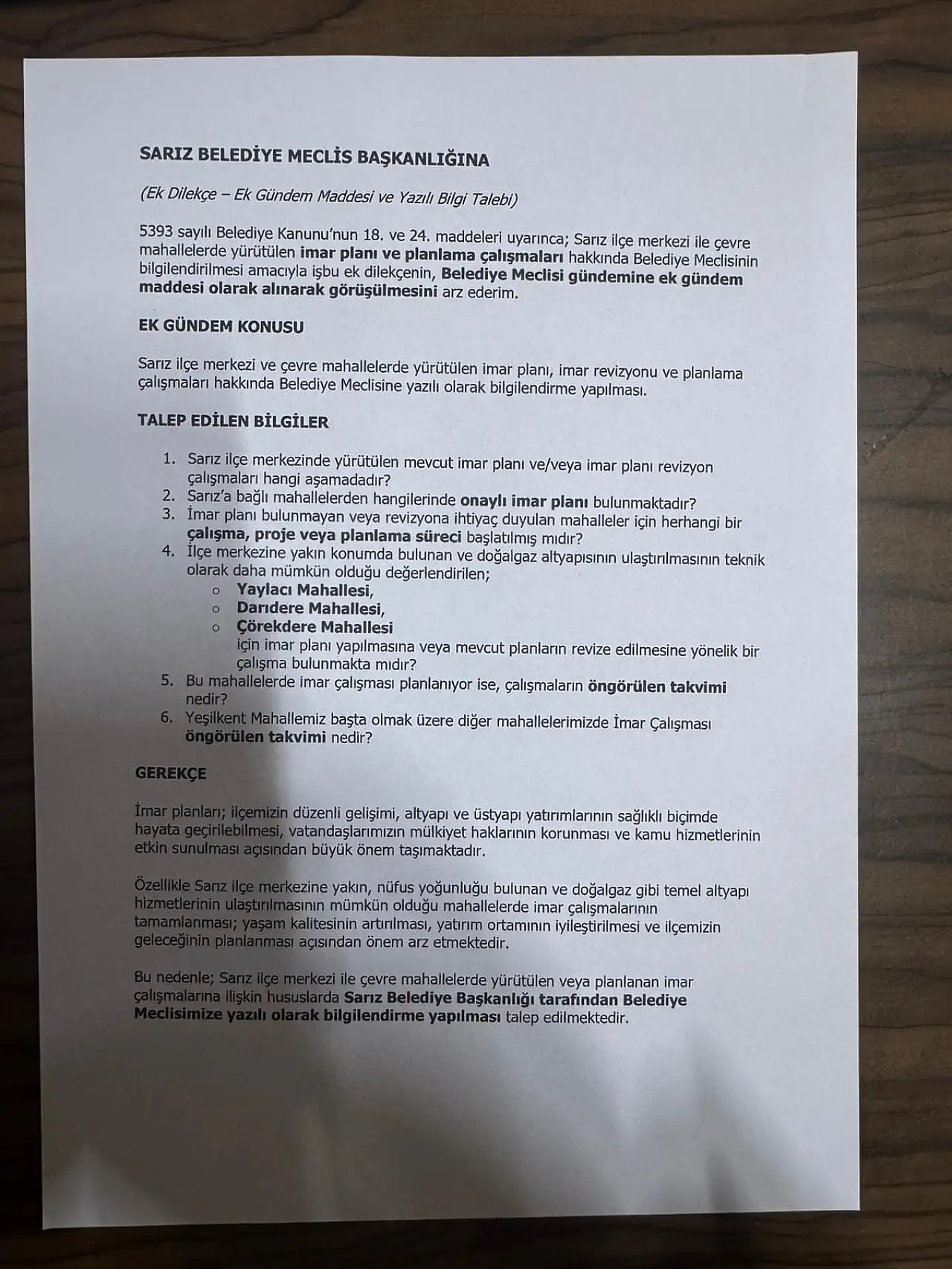 Ayrıca ilçe merkezi ve çevre mahallelerde yürütülen imar planları, revizyon süreçleri ile Yaylacı, Darıdere, Çörekdere ve Yeşilkent mahallelerine yönelik planlama takviminin kamuoyuyla paylaşılması istendi.