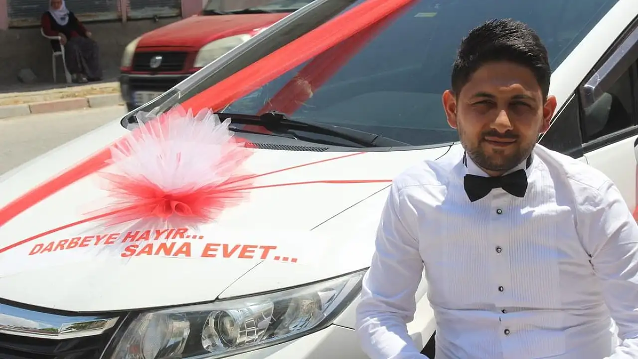 Kayseri'de gelin almaya gelen damat, düğün arabasına 'Darbeye hayır, sana evet' yazdırdı.
