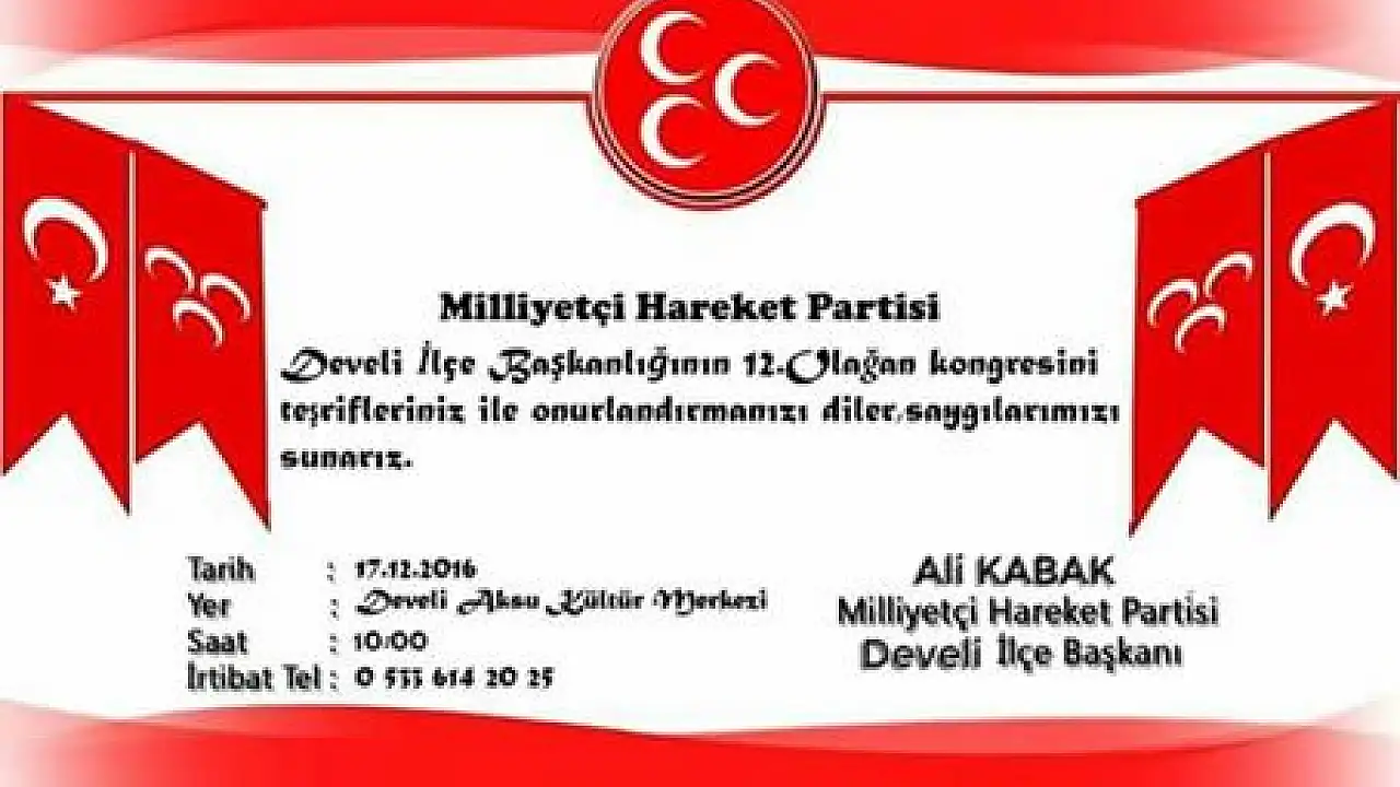 Milliyetçi Hareket Partisinde Kongre Heyecanı!!! Basınımızın Güzide Temsilcileri Konuşmama başlamadan önce hepinizi saygılarımla selamlıyorum, Hepiniz hoş geldiniz.Bu gün burada Milliyetçi Hareket Partisi Develi İlçe Başkanlığı Adaylığıma ilişkin Basın Aç