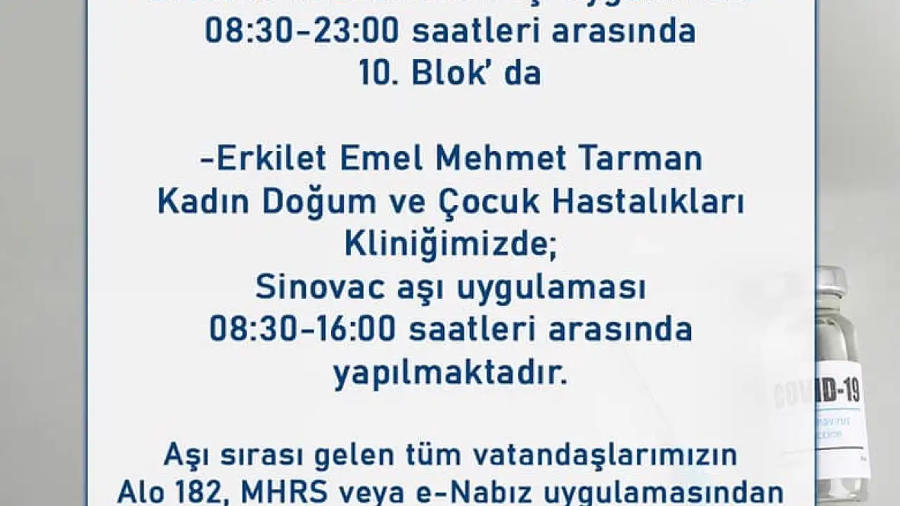 Kayseri Devlet Hastanesi'nden yapılan duyuruda, "Merkez kampüsümüzde Sinovac ve BiaNTech aşı uygulaması 08:30-23:00 saatleri arasında 10. Blok'ta Erkilet Emel Tarman Kadın Doğum ve Çocuk Hastalıkları Kliniğimizde Sinovac aşı uygulaması 08:30-16:00 saatleri arasında yapılmaktadır.
