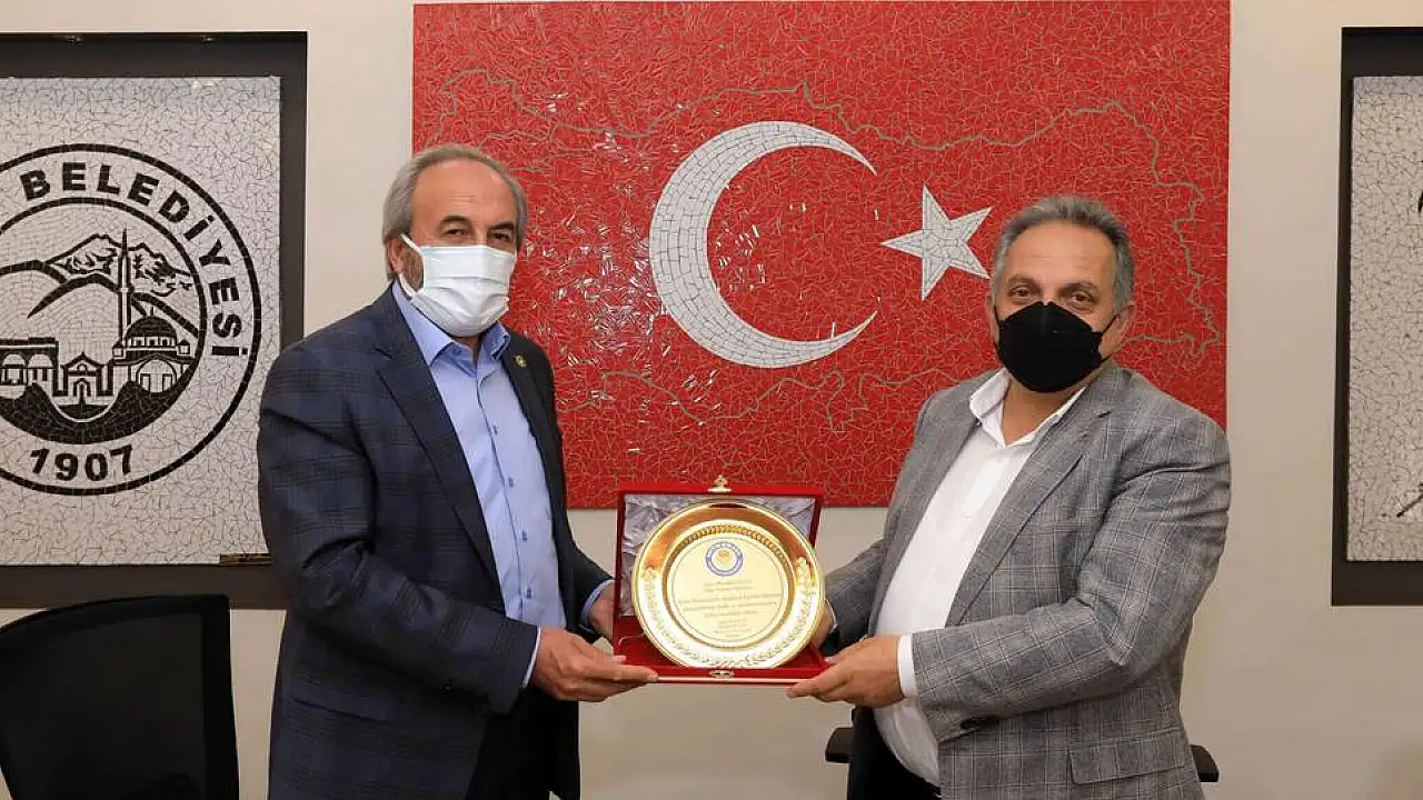 Eğitim-Bir-Sen Kayseri Şube Başkanı Aydın Kalkan, Talas ilçesindeki okullarda eğitim ve öğretim faaliyetlerine sağladığı katkı ve desteklerden dolayı Talas Belediye Başkanı Mustafa Yalçın’a teşekkür plaketi takdim etti.