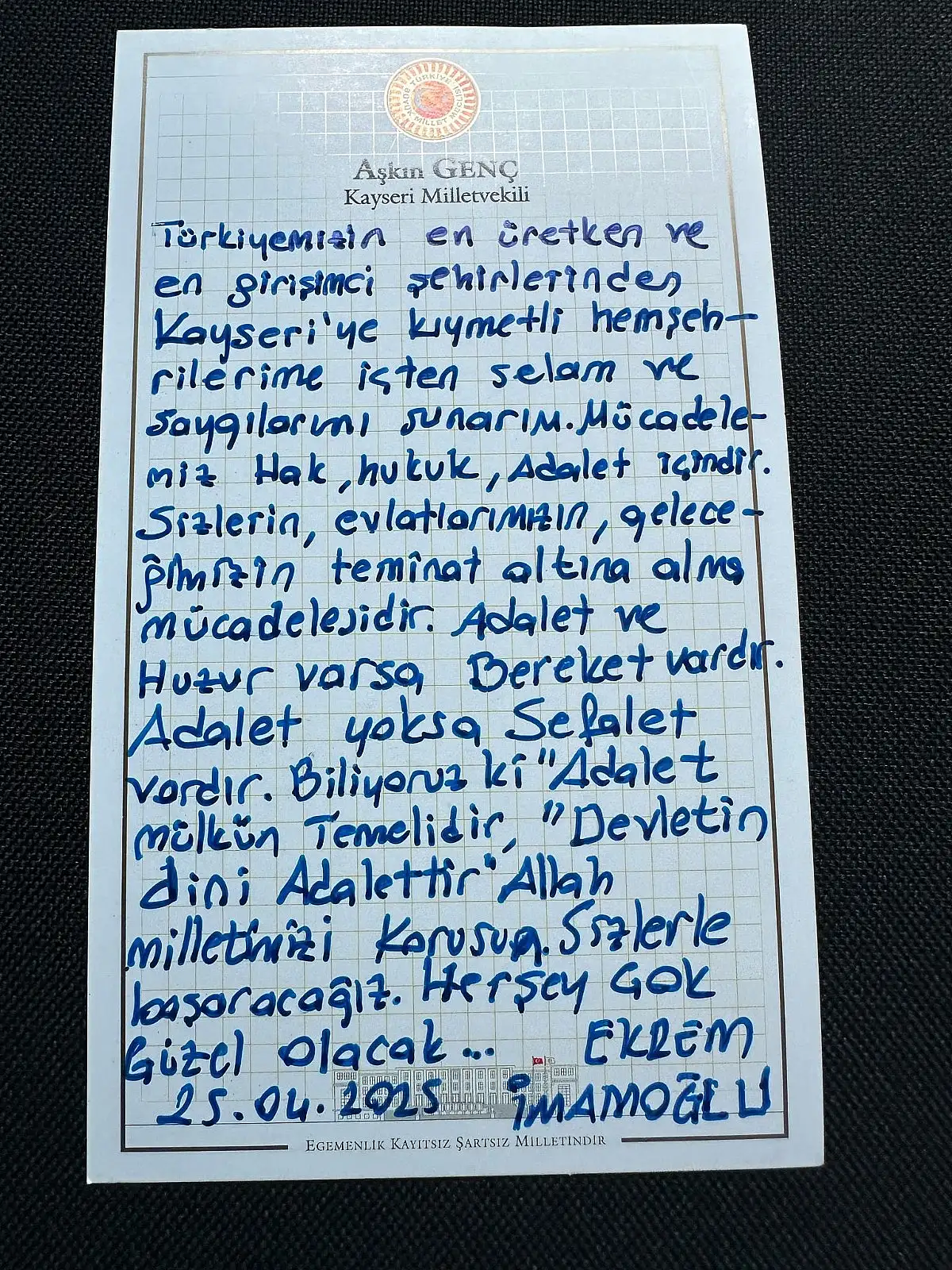 Genç’in yaptığı paylaşımda Ekrem İmamoğlu'nun Kayserililere mesajında şu ifadeler yer aldı: “Türkiye'min en üretken ve en girişimci şehirlerinden Kayseri'ye kıymetli hemşehrilerime içten selam ve saygılarını sunarım. Mücadelemiz hak, hukuk, adalet içindir. Sizlerin, evlatlarımızın, geleceğimizin teminat altına alma mücadelesidir. Adalet ve Huzur varsa bereket vardır. Adalet yoksa sefalet vardır. Biliyoruz ki "Adalet mülkün temelidir, 'Devletin dini adalettir'. Allah milletimizi korusun. Sizlerle başaracağız. Her şey çok güzel olacak. 25.04.2025 Ekrem İmamoğlu.”