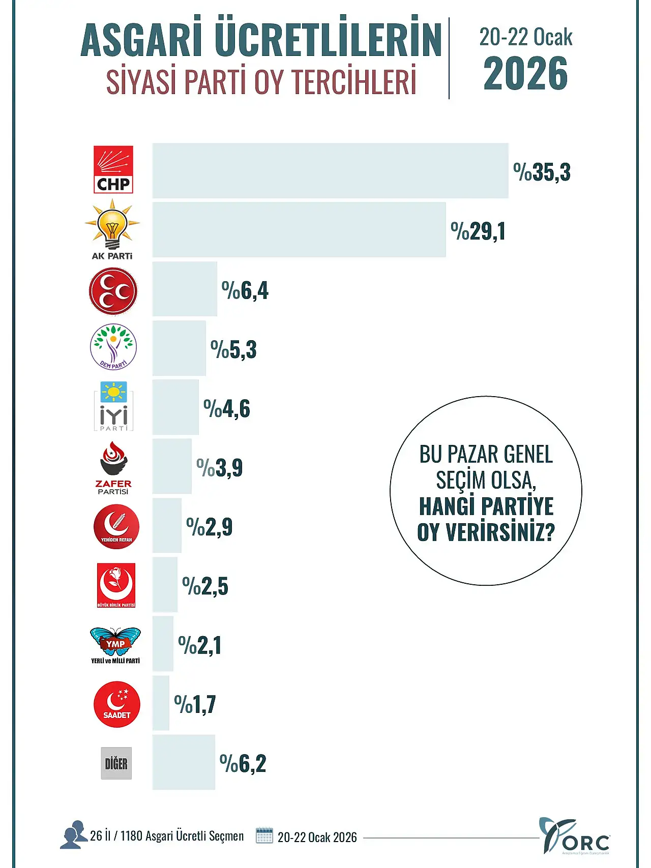 Aynı tarihlerde bin 180 asgari ücretli çalışanla yapılan “Asgari Ücretlilerin Siyasi Parti Oy Tercihleri” anketinde de benzer bir sonuç ortaya çıktı. Ankete katılanların yüzde 35,3’ü CHP’ye oy vereceğini belirtirken, AK Parti diyenlerin oranı yüzde 29,1 oldu.