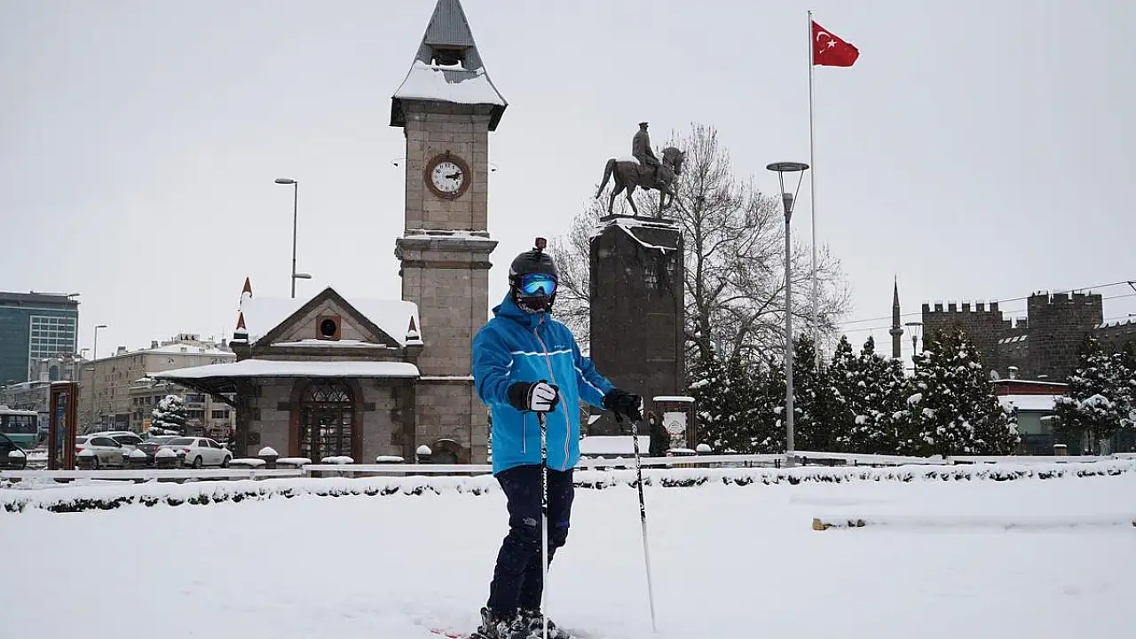 Yol kenarında biriken karların ve kaldırımlardaki karların üzerinden kayarak şehir merkezine ulaşmaya çalışan 28 yaşındaki kayakçının bu ilginç yolculuğu yaklaşık 1 saat sürdü. Sakarya, uzun yolculuğun ardından Kayseri Cumhuriyet Meydanı'na ulaştı.