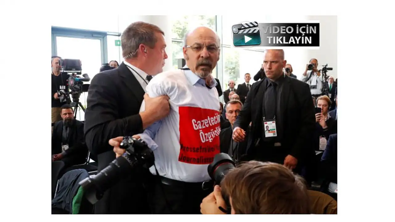 Alman bir gazetecinin tutuklu Almanlar ile ilgili sorusuna Merkel'in cevap vermesinin ardından protesto gerçekleşti. Bir gazeteci üzerinde 'gazetecilere özgürlük' yazan tişört ile protesto eylemi yaptı. Protestoya izin vermeyen Alman güvenlik güçleri, protestocuya müdahale etti ve dışarı çıkardı.
