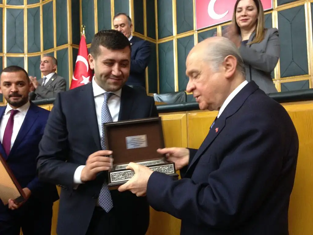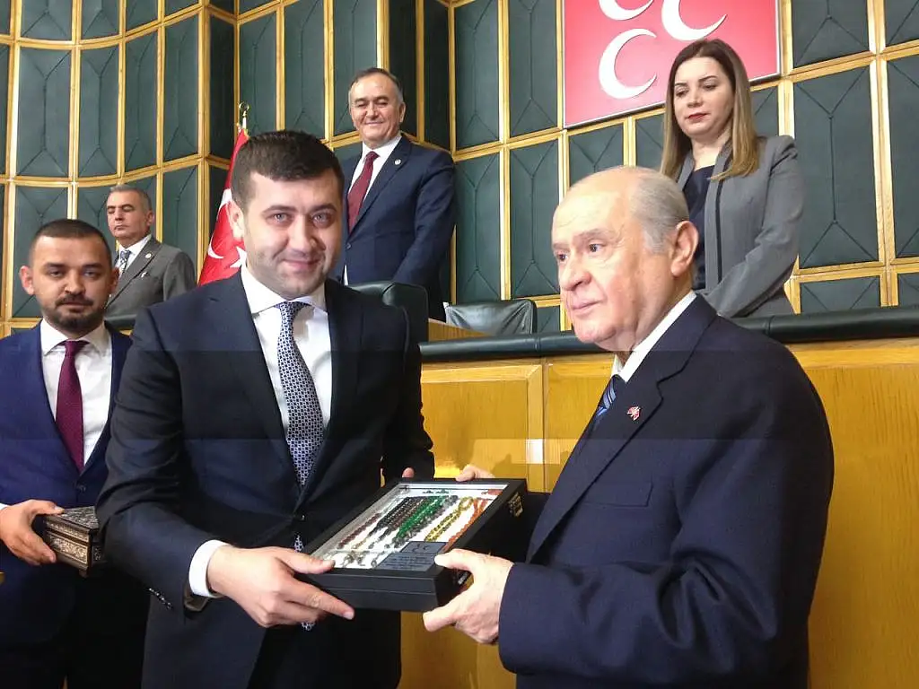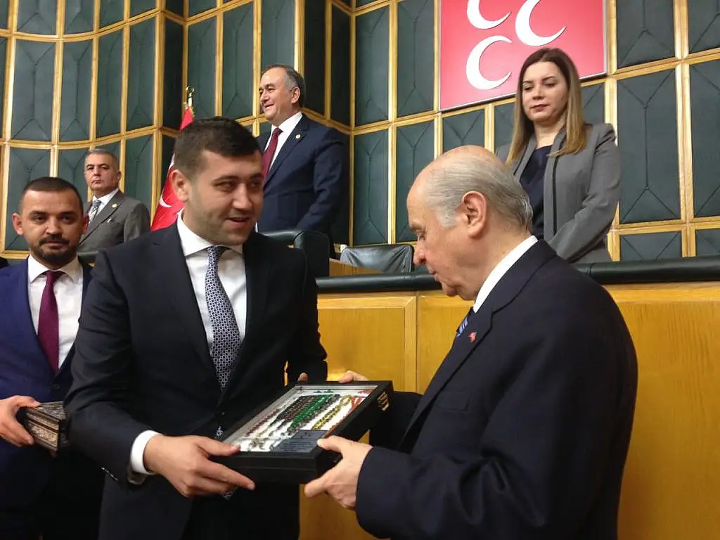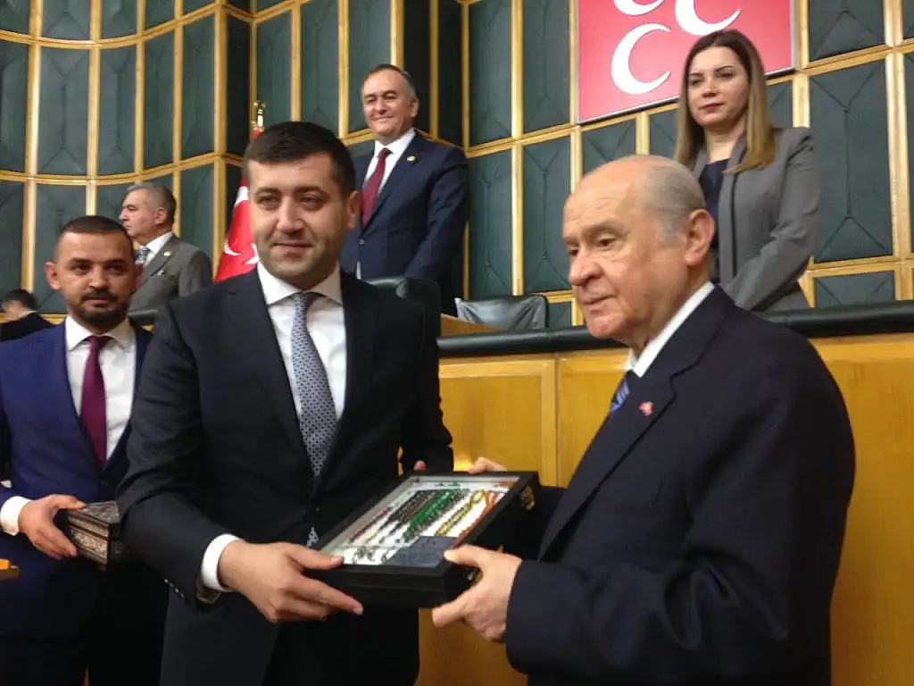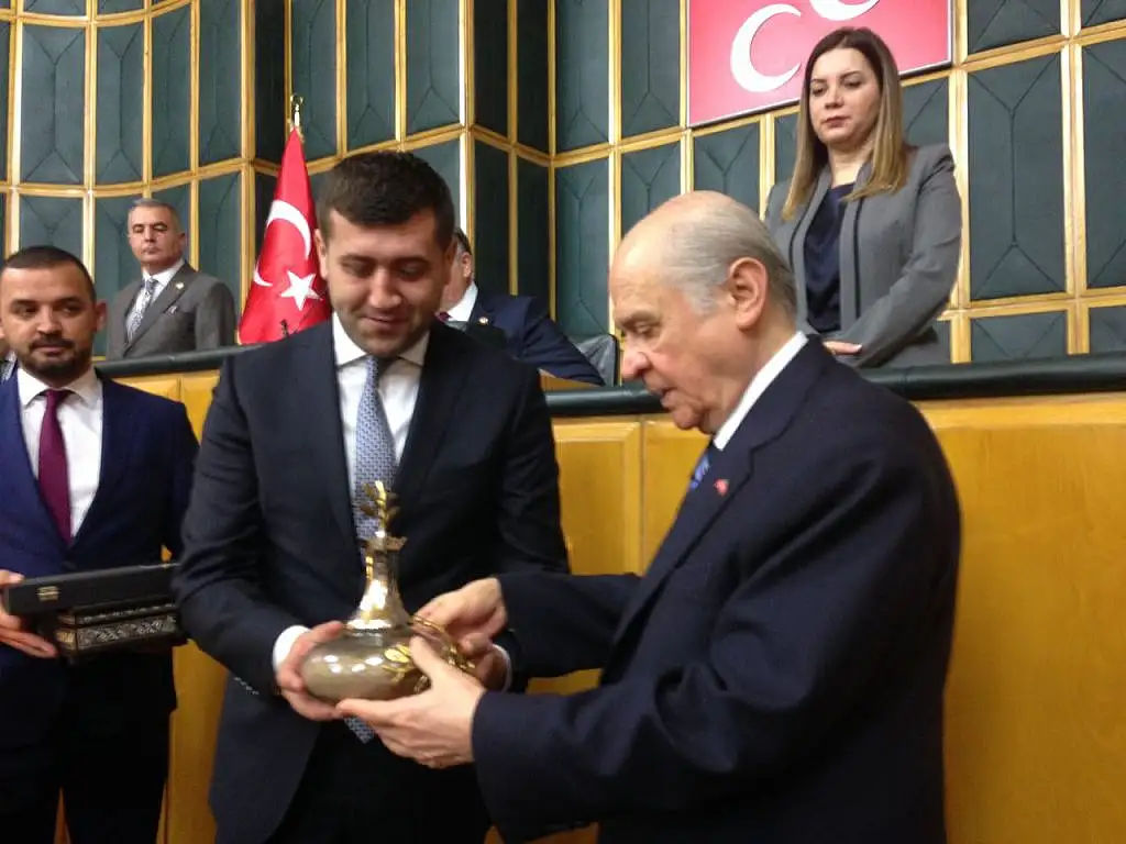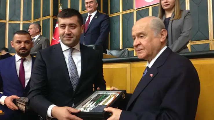 Grup konuşmasının ardından İl Başkanı Baki Ersoy MHP lideri Bahçeli özel tesbih koleksiyonu Başbuğ Alparslan Türkeş'in Ata toprağı ve el işlemeli Gümüş Kuranı Kerim hediye etti.