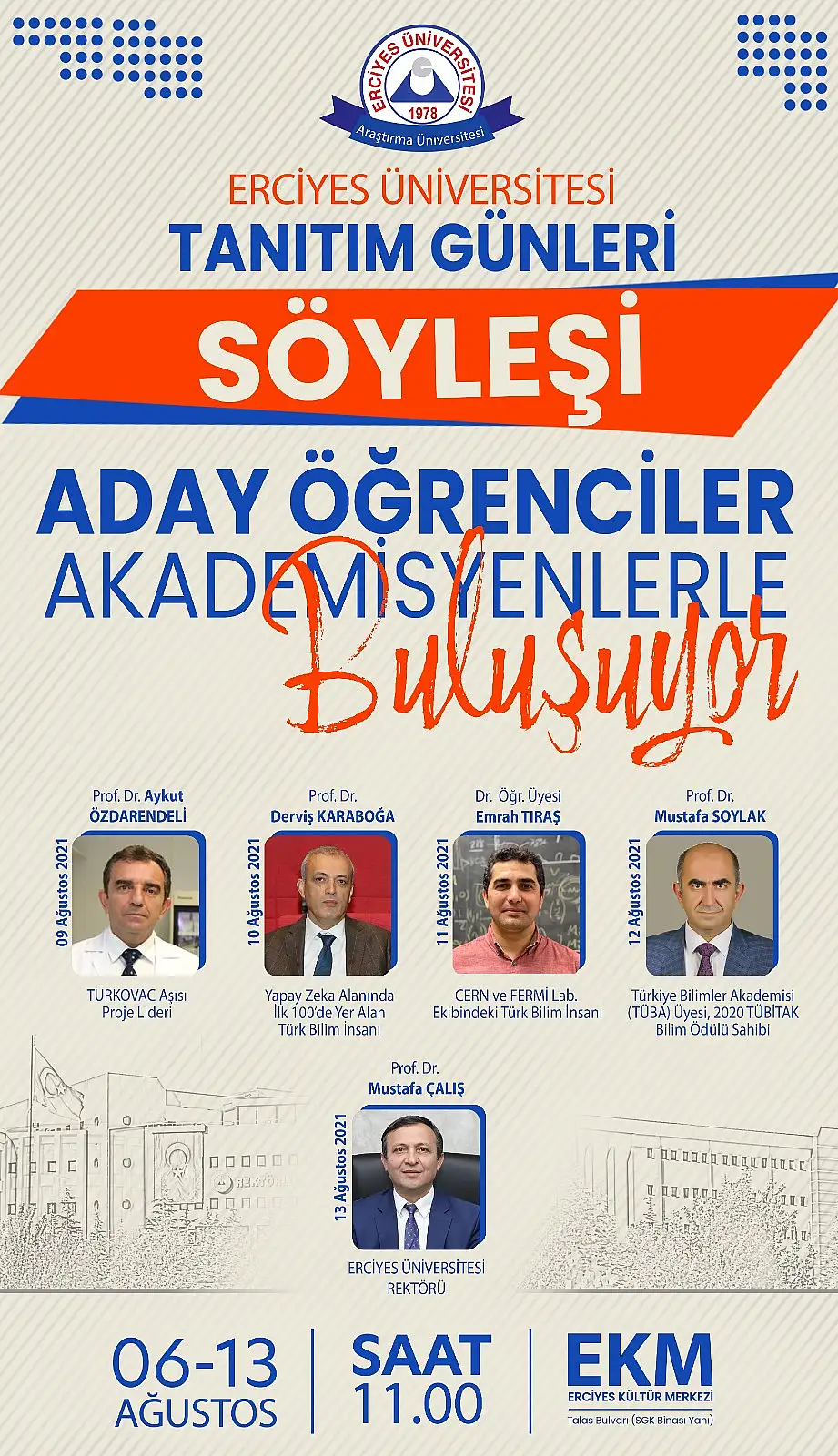 Erciyes Üniversitesi’nde (ERÜ) 6-13 Ağustos tarihlerinde düzenlenecek “Tanıtım Günleri” etkinliği ile tercih yapacak üniversite adaylarının ve ailelerinin soruları yanıtlanarak, üniversite hakkında bilgiler verilecek. Ayrıca her gün düzenlenecek söyleşi programları ile Rektör Prof. Dr. Mustafa Çalış başta olmak üzere TURKOVAC Aşısı Proje Lideri Prof. Dr. Aykut Özdarendeli, Yapay Zekâ alanında ilk 100’de yer alan Türk Bilim İnsanı Prof. Dr. Derviş Karaboğa, Türkiye Bilimler Akademisi (TÜBA) Üyesi ve 2020 TÜBİTAK Bilim Ödülü sahibi Prof. Dr. Mustafa Soylak ile CERN ve FERMİ Lab. Ekibindeki Türk Bilim İnsanı Dr. Öğretim Üyesi Emrah Tıraş aday öğrenciler ile bir araya gelecekler.