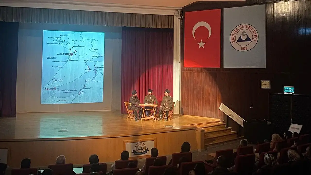 Erciyes Üniversitesi Spor Bilimleri Fakültesi Rekreasyon Bölümü öğretmen ve öğrencileri tarafından hazırlanan 'Çanakkale 1915 Biz Hep Buradayız' tiyatro oyunu sahnelendi.Yazar ve yönetmenliğini Yusuf Oğuz Altuntaş'ın üstlendiği oyunun Yardımcı Yönetmeni M