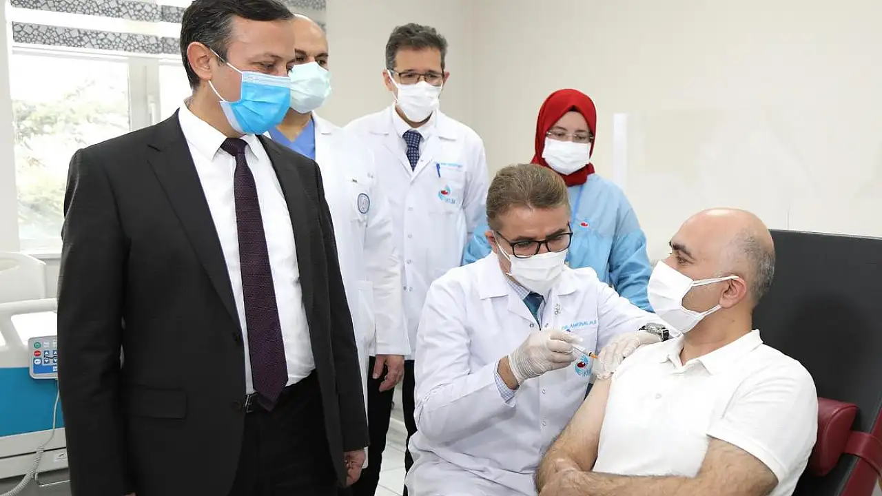 Erciyes Üniversitesi Aşı Araştırma ve Geliştirme Uygulama ve Araştırma Merkezi’nde (ERAGEM) covid-19’a karşı geliştirilen ve Sağlık Bakanlığı ile Türkiye Sağlık Enstitüleri Başkanlığı (TÜSEB) tarafından desteklenen inaktif aşı adayının faz-2 çalışmaları kapsamında ikinci dozu Erciyes Üniversitesi İyi Klinik Uygulama ve Araştırma Merkezi’nde (İKUM) gönüllüye uygulandı.