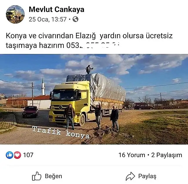 Hayatına son veren Mevlüt Çankaya'nın, sosyal medyada yaptığı paylaşımsa dikkat çekti. Çankaya, paylaşımında "Konya ve civarından Elazığ'a yardım olursa ücretsiz taşımaya hazırım" ifadelerini kullandı.