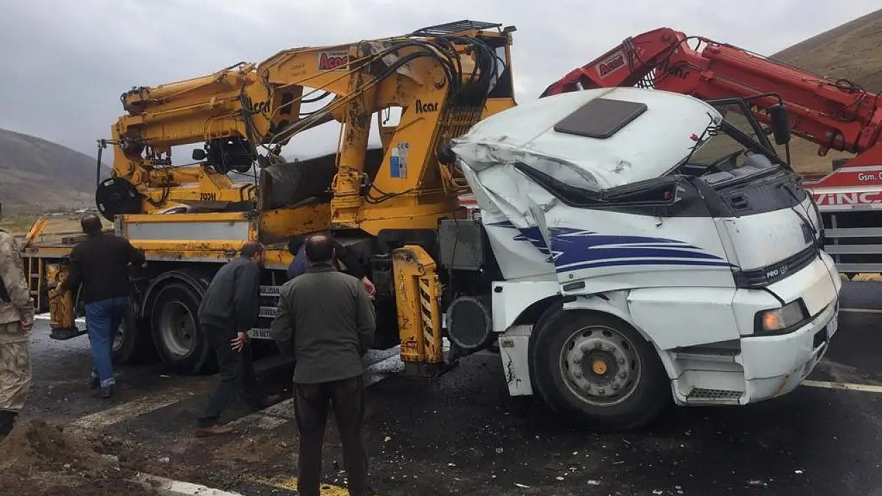 Erzurum-Çat karayolunda freni patlayan vinç bariyerlere çarparak yan yattı. Yola devrilen vinç sebebiyle durma noktasına gelen trafik, vincin kaldırılmasıyla normale döndü.