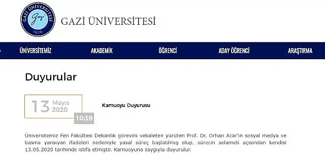 Gazi Üniversitesi'nden konuyla ilgili yapılan açıklamada şu ifadelere yer verildi: "Üniversitemiz Fen Fakültesi Dekanlık görevini vekaleten yürüten Prof. Dr. Orhan Acar'ın sosyal medya ve basına yansıyan ifadeleri nedeniyle yasal süreç başlatılmış olup, sürecin selameti açısından kendisi 13.05.2020 tarihinde istifa etmiştir. Kamuoyuna saygıyla duyurulur."