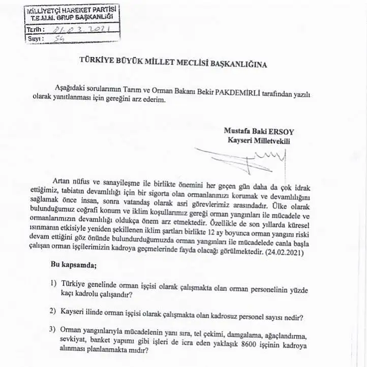 Milliyetçi Hareket Partisi Kayseri Milletvekili Baki Ersoy, geçici orman işçilerinin kadroya alınması için Tarım ve Orman Bakanlığına soru önergesi verdi.