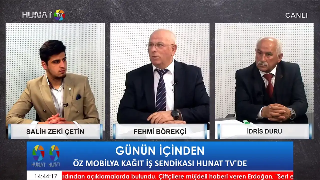 Öz Mobilya Kağıt İş Sendikası Genel Başkan Yardımcısı Fehmi Börekçi ve Kayseri Bölge Teşkilatlanma Uzmanı İdris Duru, Hunat TV'de yayınlanan Günün İçinden Programına konuk oldu.Sendika faaliyetlerinden bahseden Börekçi, işçilerin ve iş verenlerin sendikal