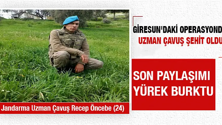 Giresun’un Doğankent ilçesi kırsalında terör örgütü PKK’ya yönelik süren operasyonlarda Jandarma Özel Harekat (JÖH) Timi’nde görevli Uzman Çavuş Recep Öncebe, iddiaya göre ‘Kobra’ diye tabir edilen zırhlı aracın silahının ateş alması sonucu ağır yaralandı. İlk müdahalesi arkadaşları tarafından yapılan Uzman Çavuş Öncebe, 112 ekiplerince hastaneye sevk edilirken yolda şehit oldu.