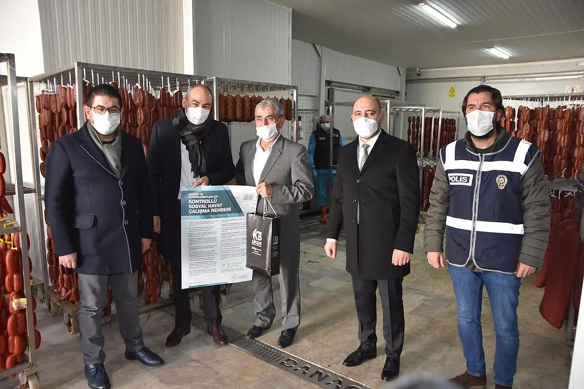 Kayseri Ticaret Odası Başkanı Ömer Gülsoy, Kayseri Ticaret Borsası Başkanı Recep Bağlamış ile birlikte İçişleri Bakanlığı'nın genelgesi doğrultusunda valilerin yönetimi ve koordinasyonunda yapılan “Yeni kontrollü normalleşme süreci” denetimi yaptı. Pastırma ve Sucuk imalatçılarının yoğun olarak bulunduğu Karpuzatan Bölgesini ziyaret eden Başkanlar, maske, mesafe ve hijyen konusunda uyarılarda bulundu. Esnafları hayırlı işler dileyen Gülsoy ve Bağlamış, imalathanelerde alınan önlemleri yerinde incelediler.