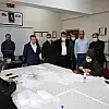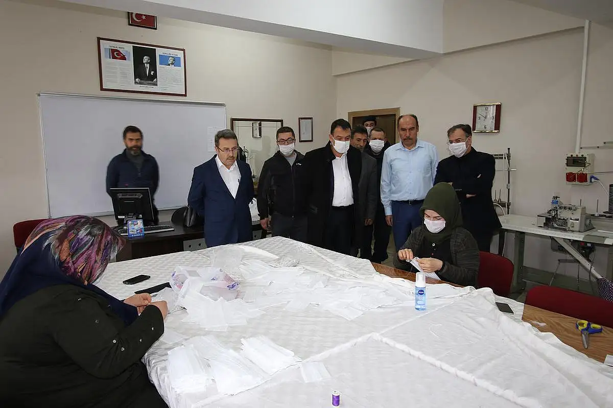 Maske üretiminin yapıldığı Rasim Çetinkaya Halk Eğitim Merkezi’nde incelemelerde bulunan Hacılar Kaymakamı Haluk Sezen ve Belediye Başkanı Bilal Özdoğan maske üretimi hakkında ilgililerden bilgi aldı.