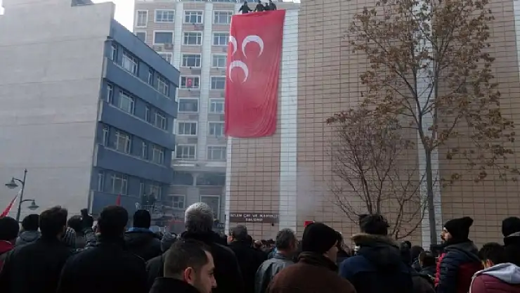İzne çıkan er ve erbaşları taşıyan araca yapılan bombalı araç saldırısının ardından Kayseri'de vatandaşlar HDP binasına saldırdı, MHP bayrağı astı.