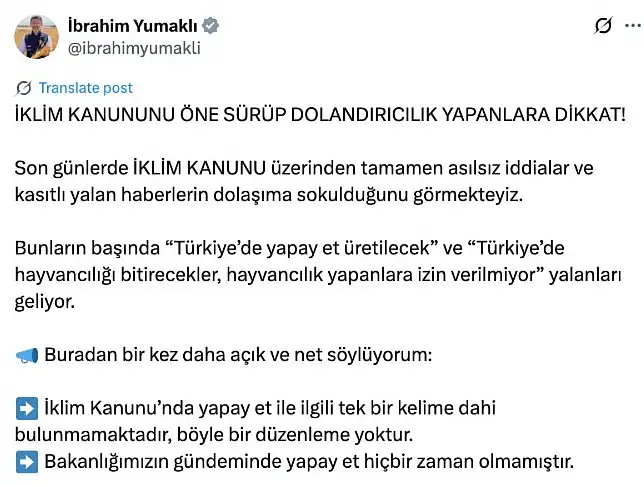 Tarım ve Orman Bakanı İbrahim Yumaklı, yaptığı açıklama ile İklim Kanunu üzerinden Türkiye'de yapay et üretileceği iddialarına yönelik, 'Bunların başında 'Türkiye'de yapay et üretilecek' ve 'Türkiye'de hayvancılığı bitirecekler, hayvancılık yapanlara izin