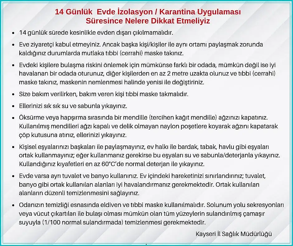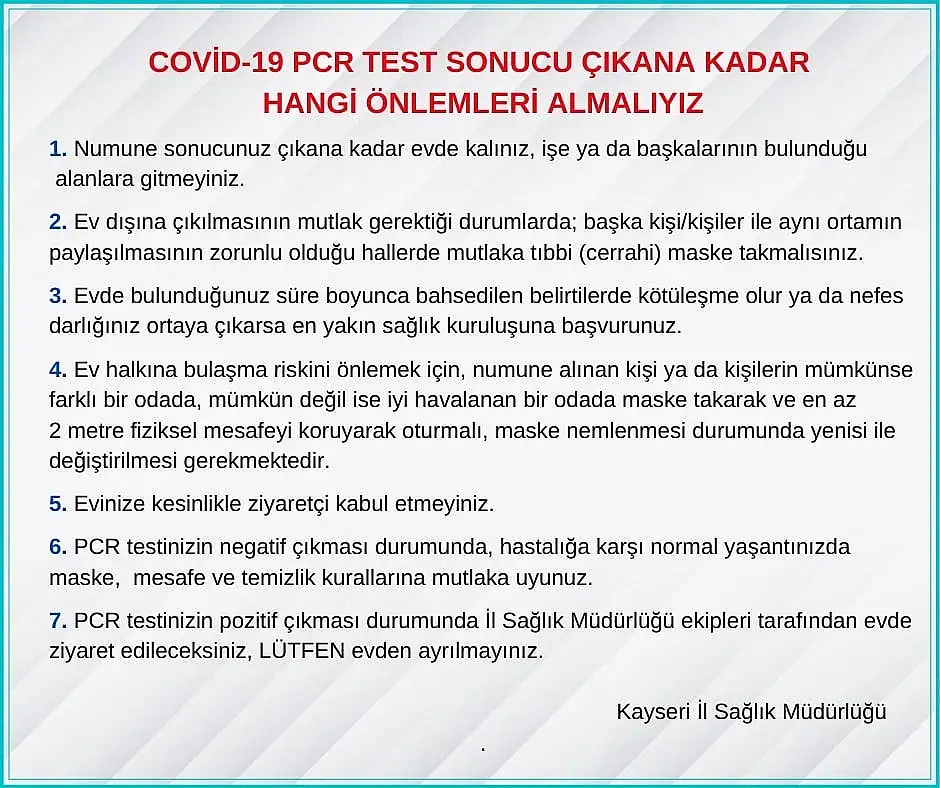 “Numune sonucunuz çıkana kadar evde kalınız, işe ya da başkalarının bulunduğu alanlara gitmeyiniz. Ev dışına çıkılmasının mutlak gerektiği durumlarda; başka kişi/kişiler ile aynı ortamın paylaşılmasının zorunlu olduğu hallerde mutlaka tıbbi (cerrahi) maske takmalısınız. Evde bulunduğunuz süre boyunca bahsedilen belirtilerde kötüleşme olur ya da nefes darlığınız ortaya çıkarsa en yakın sağlık kuruluşuna başvurunuz. Ev halkına bulaşma riskini önlemek için, numune alınan kişi ya da kişilerin mümkünse farklı bir odada, mümkün değil ise iyi havalanan bir odada maske takarak ve en az 2 metre fiziksel mesafeyi koruyarak oturmalı, maske nemlenmesi durumunda yenisi ile değiştirilmesi gerekmektedir. Evinize kesinlikle ziyaretçi kabul etmeyiniz. PCR testinizin negatif çıkması durumunda, hastalığa karşı normal yaşantınızda maske, mesafe ve temizlik kurallarına mutlaka uyunuz. PCR testinizin pozitif çıkması durumunda İl Sağlık Müdürlüğü ekipleri tarafından evde ziyaret edileceksiniz, LÜTFEN evden ayrılmayınız.”