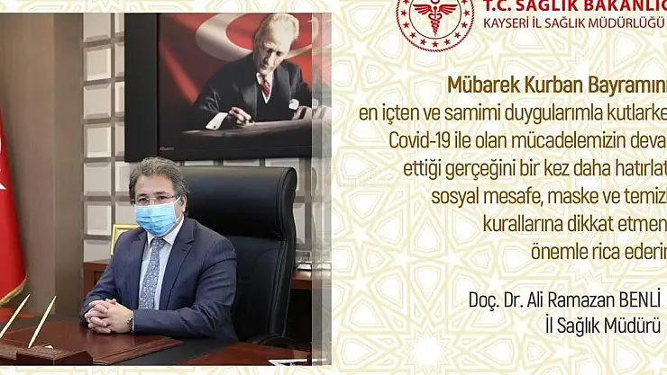 İl Sağlık Müdürü Doç. Dr. Ali Ramazan Benli, "Mübarek Kurban Bayramınızı en içten ve samimi duygularla kutlarken, Covid-19 ile mücadelemizin devam ettiği gerçeğini bir kez daha hatırlatır, sosyal mesafe, maske ve temizlik kurallarına dikkat etmenizi önemle rica ederim" mesajını paylaştı.