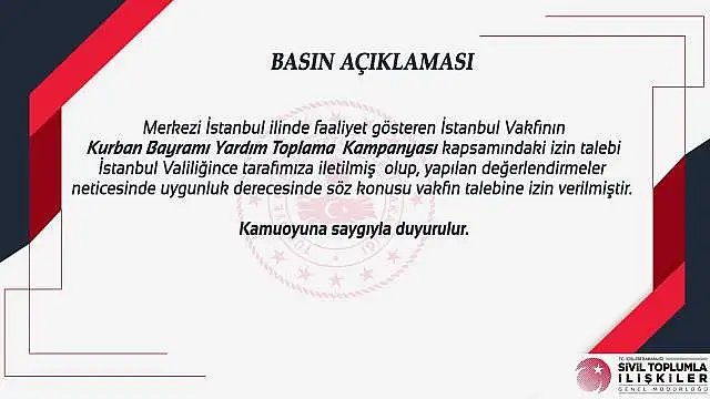 İmamoğlu'nun isyanı sonrası İçişleri Bakanlığı'ndan konuya dair bir açıklama geldi. Açıklamada "Merkezi İstanbul ilinde faaliyet gösteren İstanbul Vakfının Kurban Bayramı Yardım Toplama Kampanyası kapsamındaki izin talebi İstanbul Valiliğince tarafımıza iletilmiş olup, yapılan değerlendirmeler neticesinde uygunluk derecesinde söz konusu vakfın talebine izin verilmiştir." denildi.