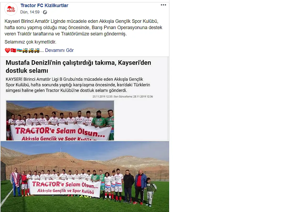 Mustafa Denizli'nin çalıştırdığı ve Barış Pınarı Harekatı'nda mehmetçiğimize destek olan İran Pers Körfez Pro Ligi ekiplerinden Tractor Kulübü'ne Kayseri Amatör Lig'de mücadele eden Akkışla Gençlik Spor Kulübü tarafından selam gönderildi.İrandaki Türkleri