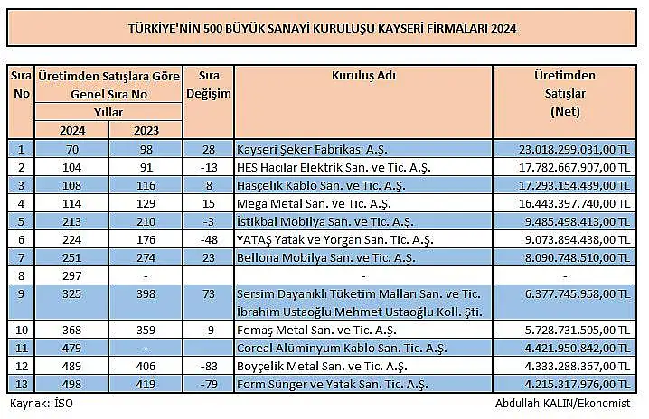 Türkiye'nin 500 Büyük Sanayi Kuruluşu listesinde 2024 yılında Kayseri’den 13 firma yer alırken 2023 yılında 14 firma yer almıştı. Üretimden satışlarda 23,1 milyar lira ile Kayseri Şeker Fabrikaları A.Ş. 70. sırada yer alırken, 17,8 milyar satışla Hes Hacılar Elektrik San. Ve Tic. A.Ş. 104. sırada ve 17,3 milyar lira satışla Hasçelik Kablo San. Ve Tic. A.Ş. 108. sırada yer aldı.