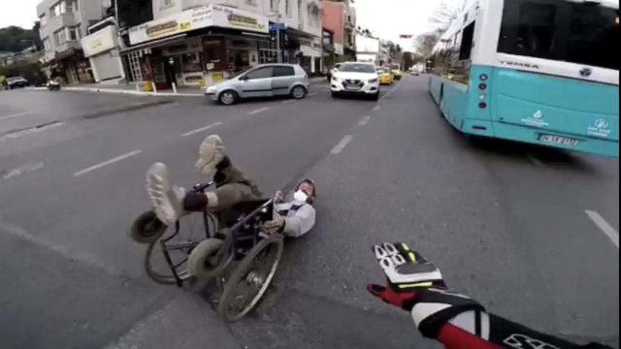 Kuruçeşme'de tekerlekli sandalye ile yolun karşısına geçmeye çalışan engelli adam, caddenin ortasında devrildi. Çevredeki sürücüler ve vatandaşlar dönüp arkasına bile bakmazken parkta bulunan motosikletli genç, yaşlı adamın yardımına koştu.