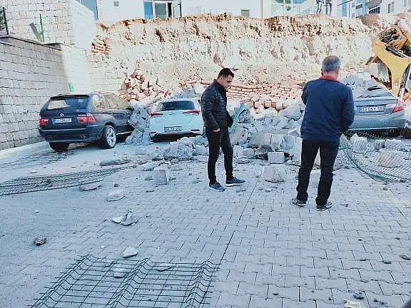 Olay, Talas ilçesi Mevlana Mahallesinde meydana geldi. Çalışma yapan iş makinası, istinat duvarının yıkılmasına sebep oldu. Yıkılan duvar molozları altında kalan araçlarda maddi hasar meydana geldi.