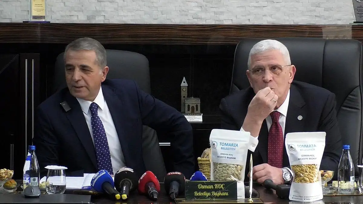 İYİ Parti Genel Başkanı Müsavat Dervişoğlu, bir dizi ziyarette bulunmak üzere Kayseri'ye geldi.Dervişoğlu'na Belediye Başkanı Koç, Tomarza'nın üretimi olan kabak çekirdeğini ikram etti.
