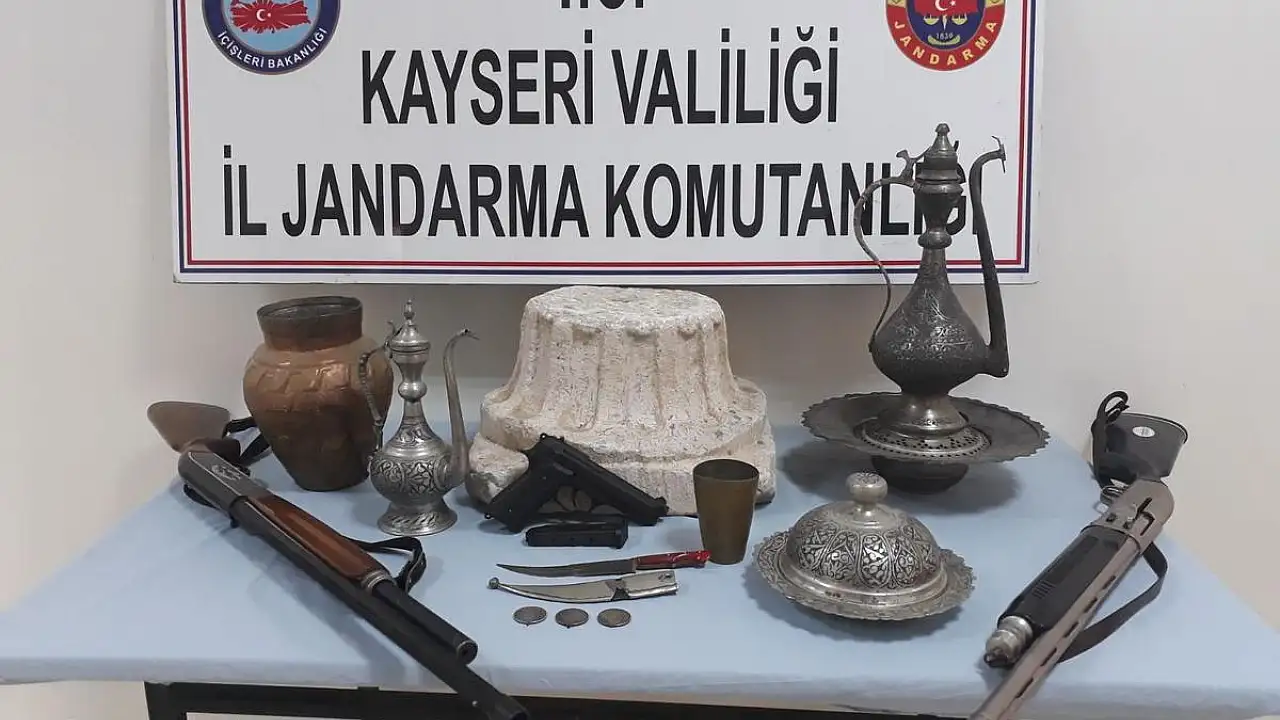 Edinilen bilgiye göre Kayseri İl Jandarma Komutanlığı ekiplerinin tarihi eser kaçakçılığı yapan şahıslara yönelik Kocasinan ilçesinde iki eve operasyon düzenledi. Evlerde yapılan aramalarda tarihi değeri olan bir adet mermer sütun altlığı, 3 adet gümüş sikke, bir adet hançer, bir adet ibrik ve altlığı, bir adet tabak ile birlikte kuru sıkı tabanca, iki adet av tüfeği ele geçirildi.