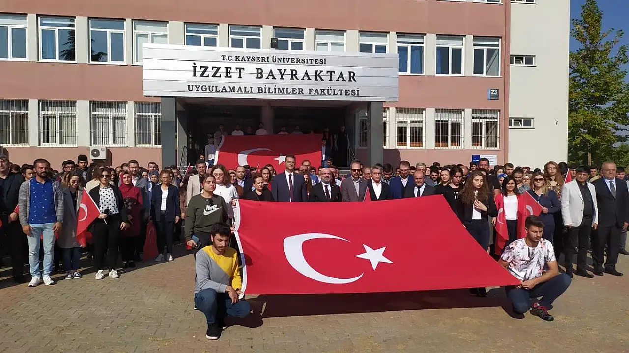 Kayseri Üniversitesi, Barış Pınarı Harekatı’nın ulaştığı başarıya, sahada kazandığımız zaferi masaya taşıyan Türkiye Cumhuriyeti’nin bu başarısını tebrik etmek ve şanlı ordumuzun yanında olduğunu göstermek amacıyla bir program düzenlendi. Saygı duruşu ve İstiklal Marşı’nın okunmasıyla başlayan programda Kayseri Üniversitesi Rektörü Kurtuluş Karamustafa bir açıklama yaptı. Karamustafa: “
