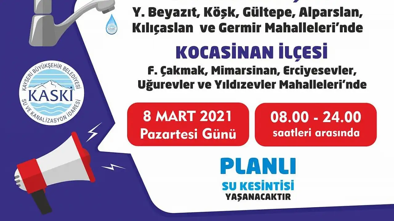 Kayseri Büyükşehir Belediyesi Su ve Kanalizasyon İdaresi (KASKİ) Genel Müdürlüğü’nce, 8 Mart Pazartesi günü 11 mahallede su kesintisi yapılacağı belirtildi.
