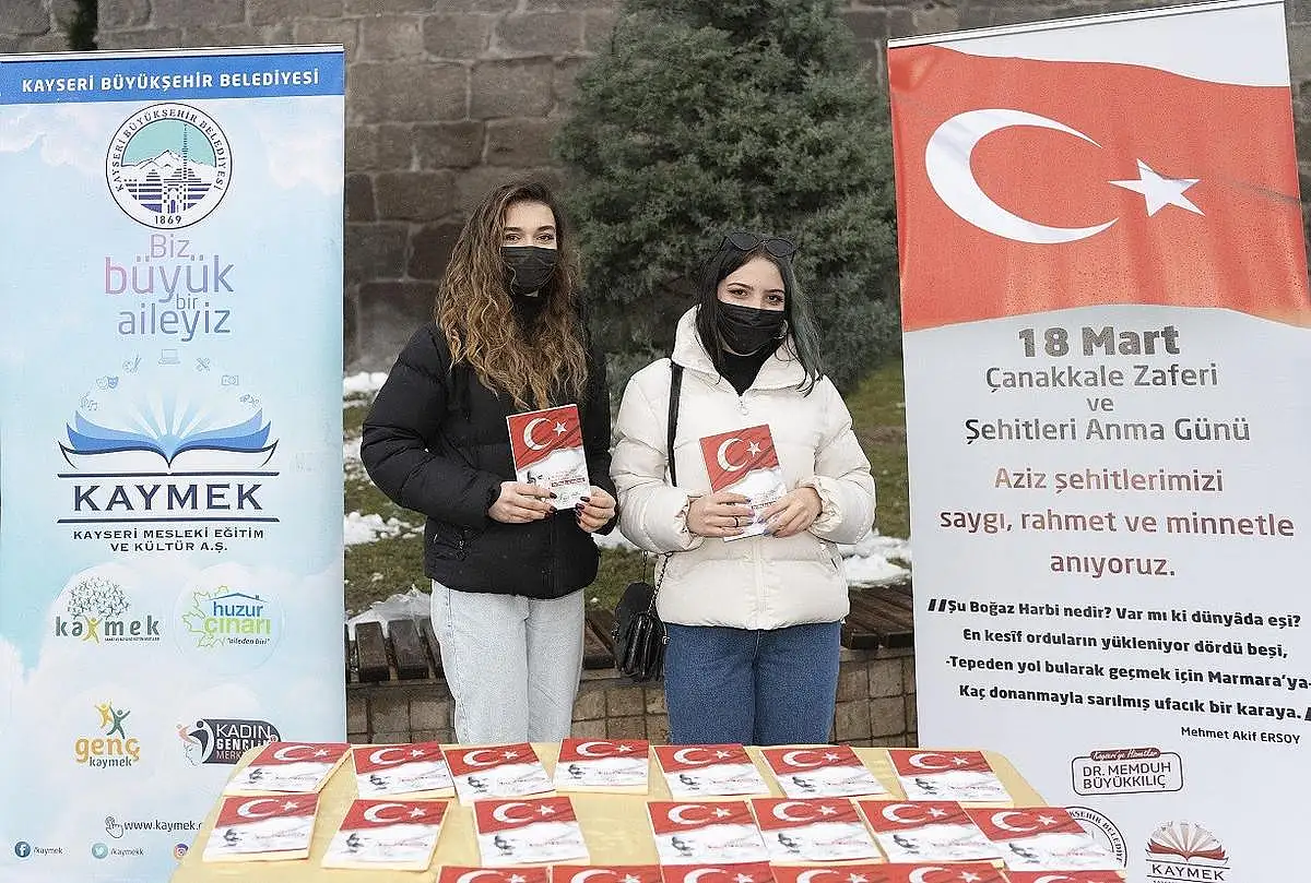 Büyükşehir Belediyesi KAYMEK A.Ş. Türk Milletinin destansı tarihini, aziz şehitleri ve bağımsızlık beyannamesi olan İstiklâl Marşı’nı Kayserililerin her bir ferdinin gönlünde hissettirmeye devam ediyor. KAYMEK, vatan sevgisi ve inancını canlı tutan İstiklal Marşı’mızın Türkiye Büyük Millet Meclisi’nde ‘Milli Marş’ olarak kabul edilişinin 100. yılı kapsamında, 18 Mart Çanakkale Zaferi ve Şehitleri Anma Günü dolayısıyla destansı tarihi anlatmak için yeni bir çalışma yaptı. Bu kapsamda KAYMEK, Cumhuriyet Meydanı, Tarihi Kayseri Kalesi önünde 2 bin adet İstiklal Ajandası’nı vatandaşlara armağan etti. Büyükşehir Belediyesi’nin milli ve manevi günlerde her zaman farkındalık oluşturduğunu ifade eden vatandaşlar, İstiklâl Ajandası için Büyükşehir Belediyesi’ne teşekkür ettiler.